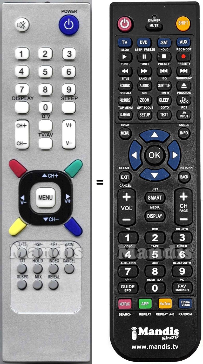 Mute, Power, 1, 2, 3, 4, 5, 6, 7, 8, 8, Display, 0, Sleep, Q.V, TV/AV, CH+, CH-, Vol+, Vol-, Red, Green, Yellow, Blue, Up/CH+, Down/CH-, Left/Vol-, Right/Vol+, Menu, I/II, →S←, →P←, Zoom, TXT, Hold, Index, Cancel, Subpg, Mix, Reveal