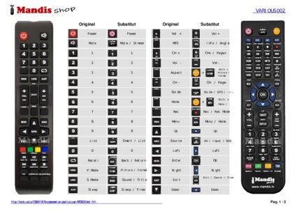 A continuació, us mostrarem la correspondència entre cada un dels botons del comandament original i el botó que realitza la mateixa funció en el comandament de substitució. En alguns casos, és possible que necessiti prémer la tecla SHIFT abans de prémer un altre botó per realitzar certes accions. Aquestes funcions addicionals sovint no s'utilitzen gaire i s'inclouen per facilitar la comprensió del comandament de substitució, o perquè el comandament original té més botons que el seu equivalent.