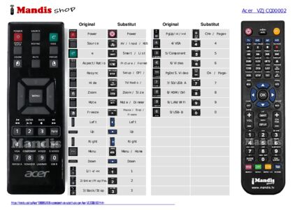 A continuació, us mostrarem la correspondència entre cada un dels botons del comandament original i el botó que realitza la mateixa funció en el comandament de substitució. En alguns casos, és possible que necessiti prémer la tecla SHIFT abans de prémer un altre botó per realitzar certes accions. Aquestes funcions addicionals sovint no s'utilitzen gaire i s'inclouen per facilitar la comprensió del comandament de substitució, o perquè el comandament original té més botons que el seu equivalent.