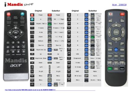 Aquest comandament a distància fa totes les funcions del comandament original: Power, e, Aspect Ratio, Freeze, Hide, Zoom, Resync, Source, Up / Keystone+, Down / Keystone-, Left, Menu, Right, 1, 2, 3, Vol UP, Vol DN, 0 / Mute, 4 / VGA, 5 / Component, 6 / Video, 7 / S-Video, 8 / HDMI, 9 / Wireless