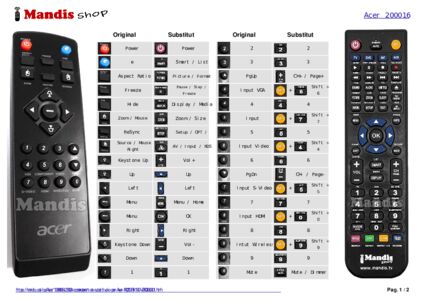 Aquest comandament a distància fa totes les funcions del comandament original: Power, e, Aspect Ratio, Freeze, Hide, Zoom / Mouse Left, Resync, Source / Mouse Right, Up / Keystone Up, Down / Keystone Down, Right, Left, Menu, 1, 2, 3, VGA / 4, Component / 5, Video / 6, S-Video / 7, HDMI / 8, Wireless / 9, Mute / 0, PgUp, PgDn