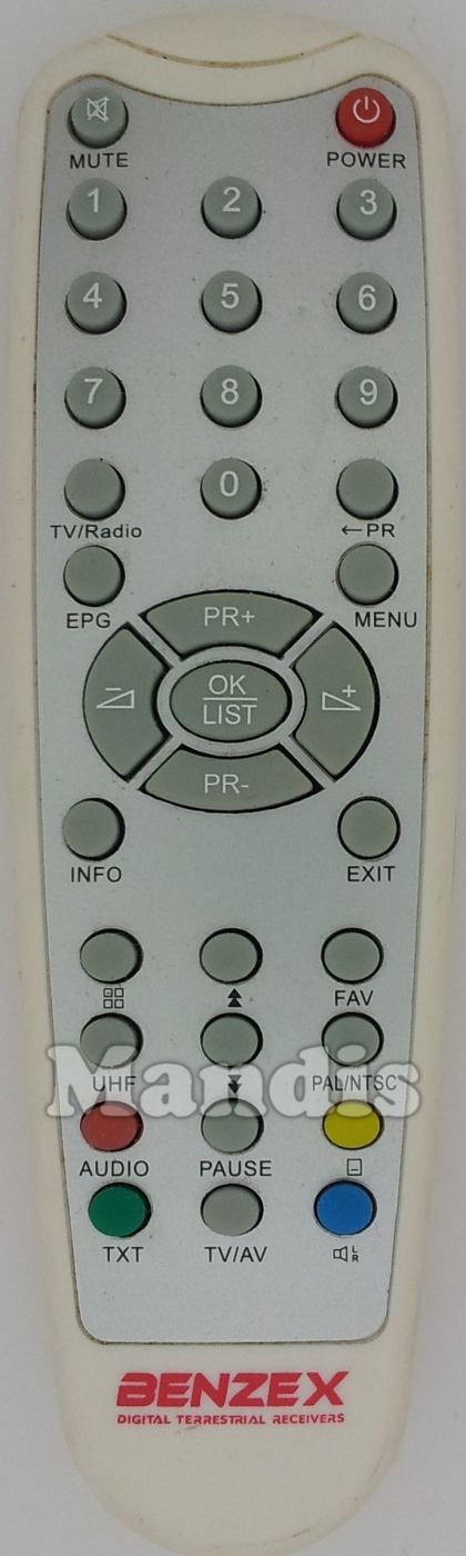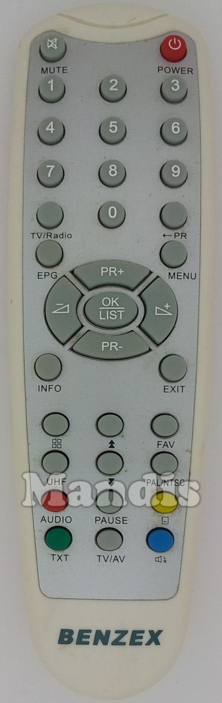 Mute, Power, 1, 2, 3, 4, 5, 6, 7, 8, 9, 0, TV/Radio, ←PR, EPG, Menu, PR+, PR-, Vol-, Vol+, OK/List, Info, Exit, [+], ︽, ︾, FAV, UHF, PAL/NTSC, Red/Audio, Pause, Yellow/[..], Green/TXT, TV/AV, Blue/Audio L/R