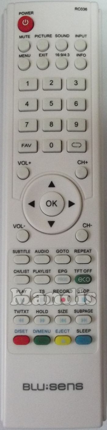 Comandament a distància original RC036-2 que serveix per televisors de la marca Blusens. Es tracta d'un model original de comandament a distància.