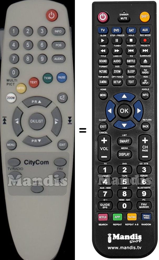 A continuació, us mostrarem la correspondència entre cada un dels botons del comandament original i el botó que realitza la mateixa funció en el comandament de substitució. En alguns casos, és possible que necessiti prémer la tecla SHIFT abans de prémer un altre botó per realitzar certes accions. Aquestes funcions addicionals sovint no s'utilitzen gaire i s'inclouen per facilitar la comprensió del comandament de substitució, o perquè el comandament original té més botons que el seu equivalent.