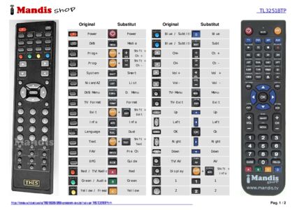 A continuació, us mostrarem la correspondència entre cada un dels botons del comandament original i el botó que realitza la mateixa funció en el comandament de substitució. En alguns casos, és possible que necessiti prémer la tecla SHIFT abans de prémer un altre botó per realitzar certes accions. Aquestes funcions addicionals sovint no s'utilitzen gaire i s'inclouen per facilitar la comprensió del comandament de substitució, o perquè el comandament original té més botons que el seu equivalent.