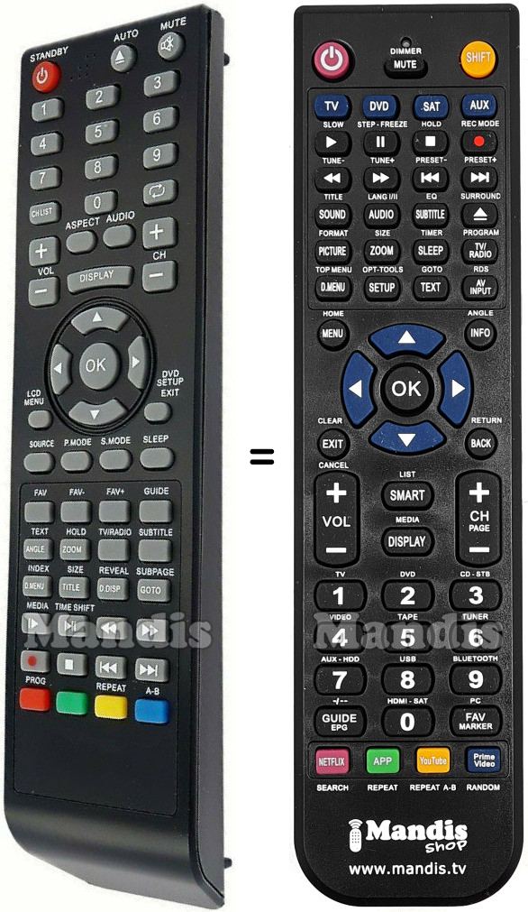 Sí, el comandament equivalent realitza totes les funcions, fins i tot quan el comandament original controla diversos aparells. Al comandament equivalent es poden programar els camps de diferents aparells (TV, DVD, SAT i AUX) d'aquesta manera es pot incloure totes les funcions del comandament original. Si si visualitza el manual de les tecles (instruccions del comandament a distància) podrà comprovar que hi ha totes les funcions.