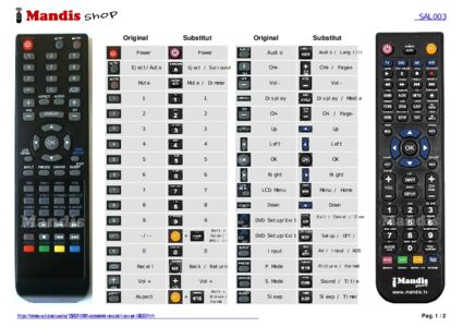 A continuació, us mostrarem la correspondència entre cada un dels botons del comandament original i el botó que realitza la mateixa funció en el comandament de substitució. En alguns casos, és possible que necessiti prémer la tecla SHIFT abans de prémer un altre botó per realitzar certes accions. Aquestes funcions addicionals sovint no s'utilitzen gaire i s'inclouen per facilitar la comprensió del comandament de substitució, o perquè el comandament original té més botons que el seu equivalent.