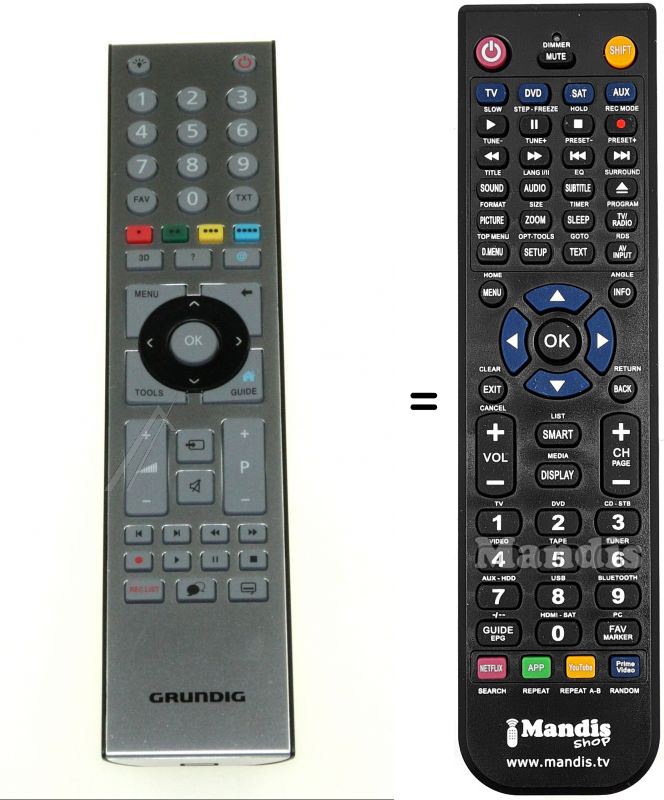 Sí, el comandament equivalent realitza totes les funcions, fins i tot quan el comandament original controla diversos aparells. Al comandament equivalent es poden programar els camps de diferents aparells (TV, DVD, SAT i AUX) d'aquesta manera es pot incloure totes les funcions del comandament original. Si si visualitza el manual de les tecles (instruccions del comandament a distància) podrà comprovar que hi ha totes les funcions.