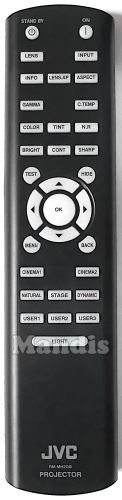 Aquest comandament té els següents botons: stand by, on, lens, input, info, lens.ap, aspect, gamma, c.temp, color, tint, n.r, bright, cont, sharp, cinema1, cinema2, natural, stage, dynamic, user1, user2, user3, ok, up, down, right, left, test, hide, menu, back