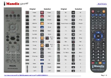 A continuació, us mostrarem la correspondència entre cada un dels botons del comandament original i el botó que realitza la mateixa funció en el comandament de substitució. En alguns casos, és possible que necessiti prémer la tecla SHIFT abans de prémer un altre botó per realitzar certes accions. Aquestes funcions addicionals sovint no s'utilitzen gaire i s'inclouen per facilitar la comprensió del comandament de substitució, o perquè el comandament original té més botons que el seu equivalent.