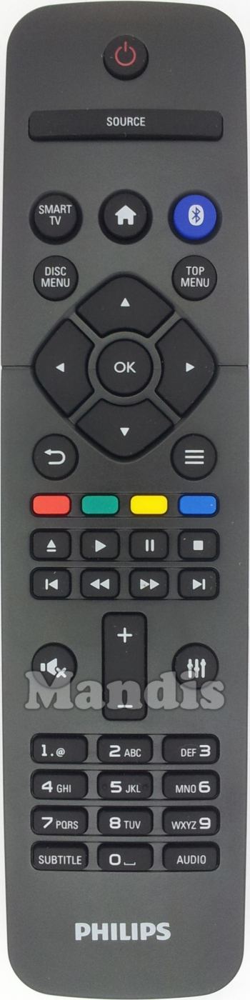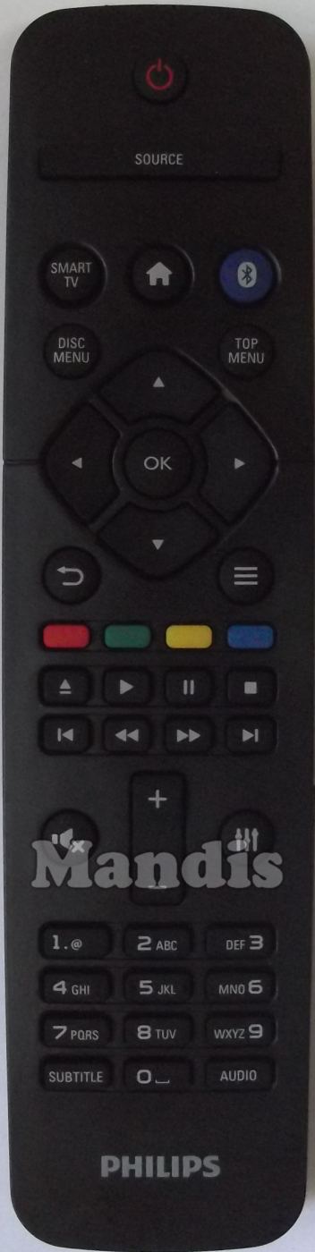 Power, Source, Smart Tv, Home, Bluetooth, Disc Menu, Top Menu, Back, =, Up, Down, Left, Right, OK, Red, Green, Yellow, Blue, Eject, Play, Pause, Stop, I<, <<, >>, >I, Mute, III, Vol+, Vol-, 1, 2, 3, 4, 5, 6, 7, 8, 9, Subtitle, 0, Audio
