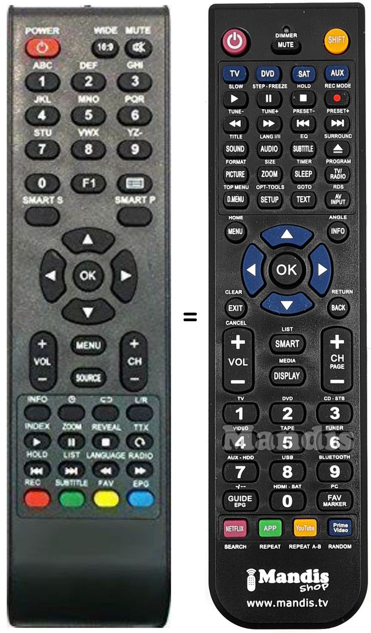 A continuació, us mostrarem la correspondència entre cada un dels botons del comandament original i el botó que realitza la mateixa funció en el comandament de substitució. En alguns casos, és possible que necessiti prémer la tecla SHIFT abans de prémer un altre botó per realitzar certes accions. Aquestes funcions addicionals sovint no s'utilitzen gaire i s'inclouen per facilitar la comprensió del comandament de substitució, o perquè el comandament original té més botons que el seu equivalent.