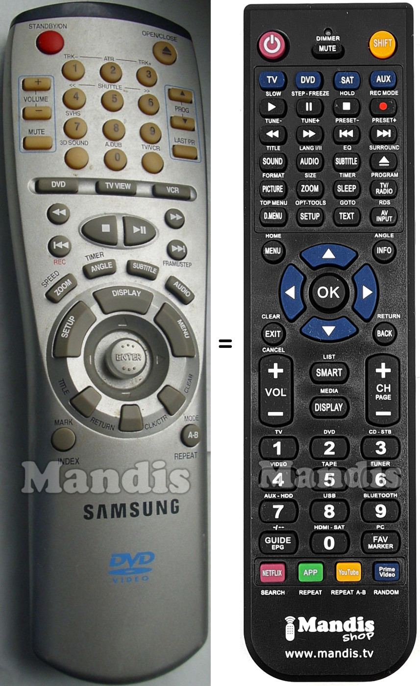 Sí, el comandament equivalent realitza totes les funcions, fins i tot quan el comandament original controla diversos aparells. Al comandament equivalent es poden programar els camps de diferents aparells (TV, DVD, SAT i AUX) d'aquesta manera es pot incloure totes les funcions del comandament original. Si si visualitza el manual de les tecles (instruccions del comandament a distància) podrà comprovar que hi ha totes les funcions.