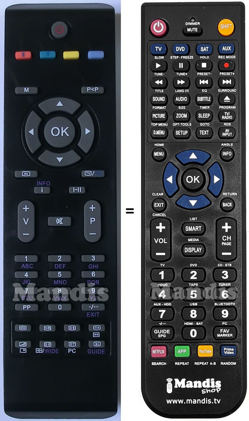 A continuació, us mostrarem la correspondència entre cada un dels botons del comandament original i el botó que realitza la mateixa funció en el comandament de substitució. En alguns casos, és possible que necessiti prémer la tecla SHIFT abans de prémer un altre botó per realitzar certes accions. Aquestes funcions addicionals sovint no s'utilitzen gaire i s'inclouen per facilitar la comprensió del comandament de substitució, o perquè el comandament original té més botons que el seu equivalent.