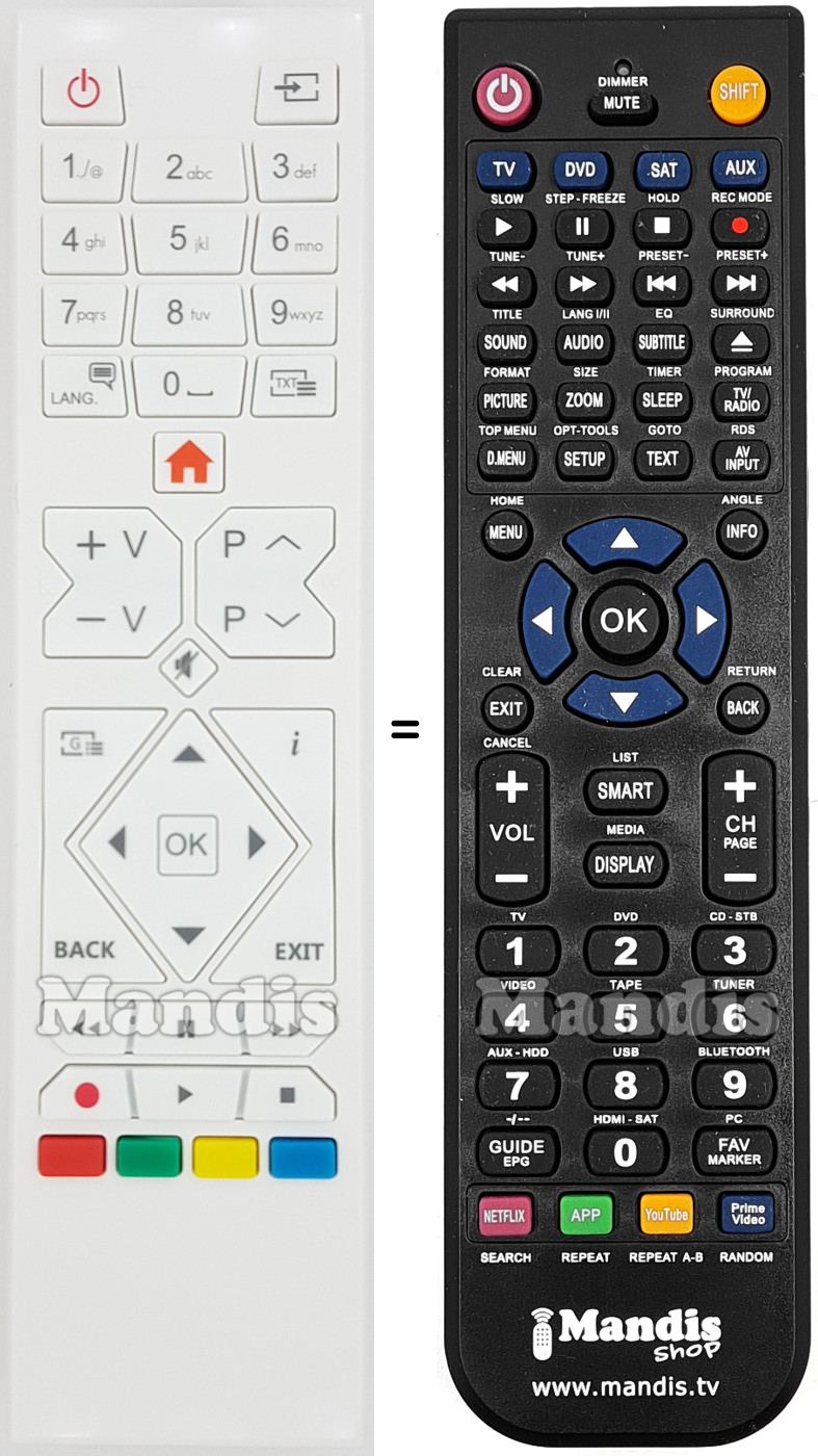 Below, we will show you the correspondence between each button on the original remote control and the button that performs the same function on the replacement remote control. In some cases, you may need to press the SHIFT key before pressing another button to perform certain actions. These additional functions are often not widely used and are included to facilitate understanding of the replacement remote control, or because the original remote control has more buttons than its equivalent.