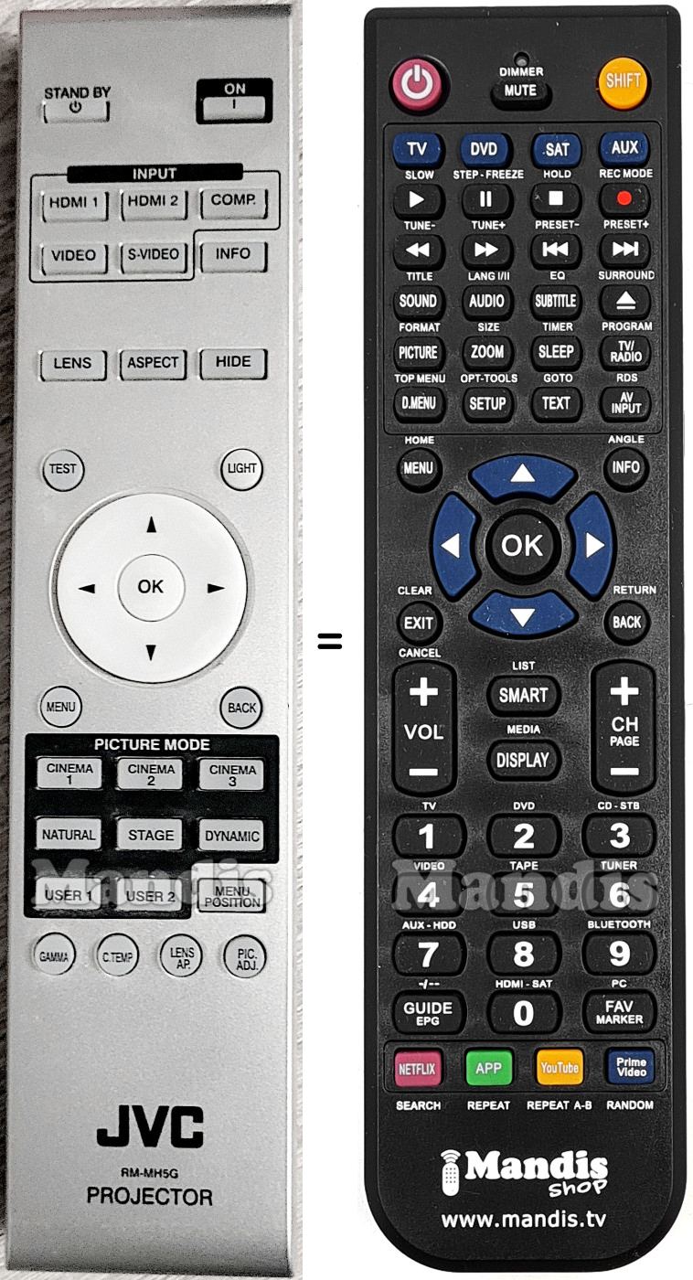 Below, we will show you the correspondence between each button on the original remote control and the button that performs the same function on the replacement remote control. In some cases, you may need to press the SHIFT key before pressing another button to perform certain actions. These additional functions are often not widely used and are included to facilitate understanding of the replacement remote control, or because the original remote control has more buttons than its equivalent.