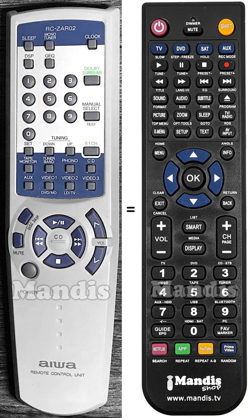 Below, we will show you the correspondence between each button on the original remote control and the button that performs the same function on the replacement remote control. In some cases, you may need to press the SHIFT key before pressing another button to perform certain actions. These additional functions are often not widely used and are included to facilitate understanding of the replacement remote control, or because the original remote control has more buttons than its equivalent.