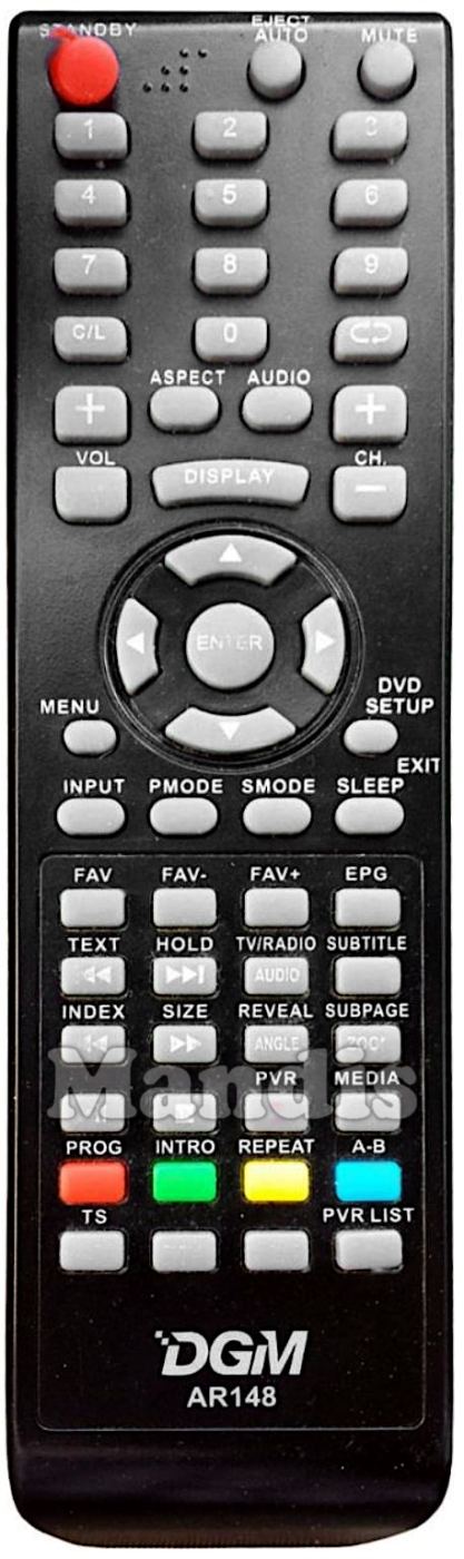 Standby, Eject / Auto, Mute, 1, 2, 3, 4, 5, 6, 7, 8, 9, 0, C/L, Recall, Vol+, Vol-, Aspect, Audio, CH+, CH-, Display, Up, Left, Enter, Right, Down, Menu, DVD Setup / Exit, Input, PMode, SMode, Sleep, Fav, Fav-, Fav+, EPG, I<< / Text, >>I / Hold, TV/Radio / Audio, Subtitle, Index / <<, Size / >>, Reveal / Angle, Subpage / Zoom, Play / Pause, Stop, PVR / Rec, Media, Red / Prog, Green / Intro, Yellow / Repeat, Blue / A-B, TS, , , PVR List