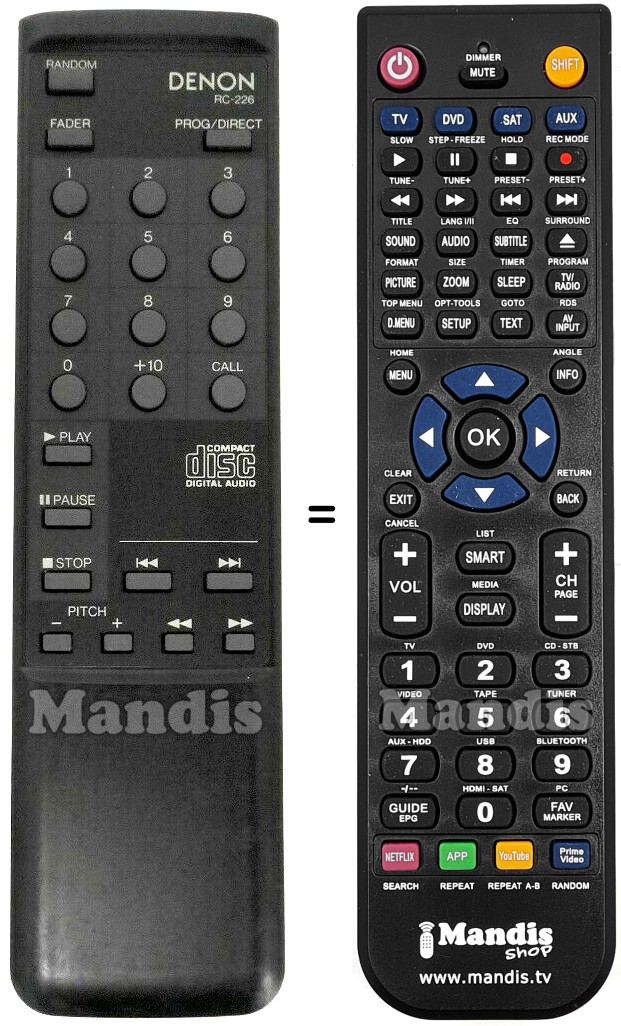 Below, we will show you the correspondence between each button on the original remote control and the button that performs the same function on the replacement remote control. In some cases, you may need to press the SHIFT key before pressing another button to perform certain actions. These additional functions are often not widely used and are included to facilitate understanding of the replacement remote control, or because the original remote control has more buttons than its equivalent.