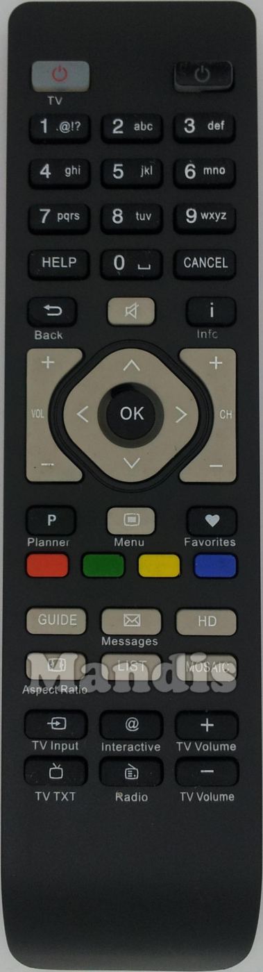 This remote control has the following buttons: Power TV, Power, 1, 2, 3, 4, 5, 6, 7, 8, 9, 0, Help, Cancel, Back, Mute, Info, Vol+, Vol-, CH+, CH-, Up, Down, Left, Right, OK, Planner, Menu, Favorites, Red, Green, Yellow, Blue, Guide, Massges, HD, Aspect Ratio, List, Mosaic, TV Input, Interactive, TV Volume+, TV Volume-, TV TXT, Radio