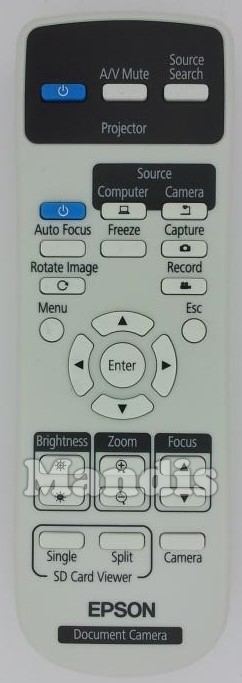 Power Projector, A/V/Mute, Source Search, Power, Computer, Camera, Auto Focus, Freeze, Capture, Rotate Image, Record, Menu, Esc, Up, Down, Left, Right, Enter, Brightness+, Brightness-, Zoom+, Zoom-, Focus+, Focus-, Single, Split, Camera