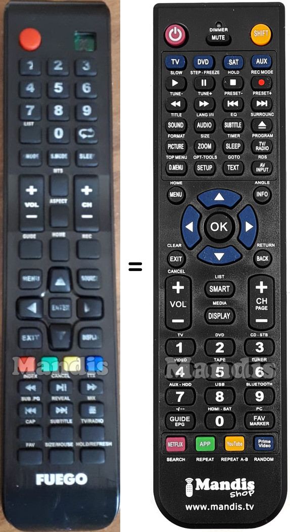 Below, we will show you the correspondence between each button on the original remote control and the button that performs the same function on the replacement remote control. In some cases, you may need to press the SHIFT key before pressing another button to perform certain actions. These additional functions are often not widely used and are included to facilitate understanding of the replacement remote control, or because the original remote control has more buttons than its equivalent.