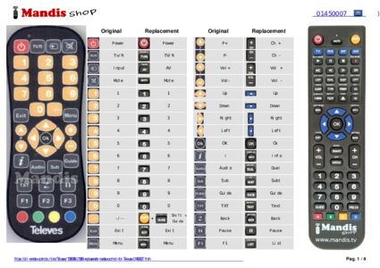 Below, we will show you the correspondence between each button on the original remote control and the button that performs the same function on the replacement remote control. In some cases, you may need to press the SHIFT key before pressing another button to perform certain actions. These additional functions are often not widely used and are included to facilitate understanding of the replacement remote control, or because the original remote control has more buttons than its equivalent.