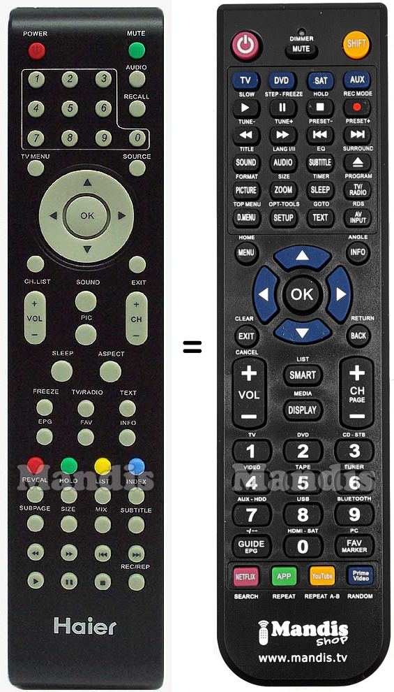 This remote control performs all the functions of the original remote control: Power, Mute, Audio, Recall, 1, 2, 3, 4, 5, 6, 7, 8, 9, 0, Source, Tv Menu, Exit, CH.List, Sound, PIC, Aspect, Sleep, Vol+, Vol-, CH+, CH-, Up, Down, Right, Left, OK, Freeze, Tv/Radio, Text, EPG, FAV, Info, Red, Green, Yellow, Blue, Reveal, Hold, List, Index, Subpage, Size, Mix, Subtitle, <<, >>, I<<, >>I, Play, Pause, Stop, Rec/Rep