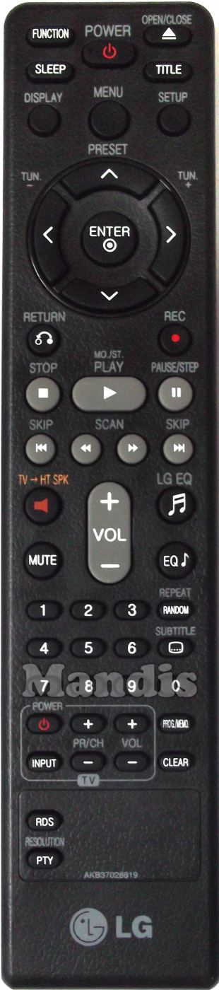 Power, Function, Open / Close, Sleep, Title, Display, Menu, Setup, Up / Preset +, Down / Preset -, Right / Tun. +, Left / Tun. -, Enter, Return, Rec, Stop, Play / Mo./St., Pause / Step, I<< Skip, << Scan, Scan >>, Skip >>I , TV --> HT SPK, LG EQ, Vol +, Vol -, Mute, EQ, 1, 2, 3, 4, 5, 6, 7, 8, 9, 0, Random / Repeat, Subtitle, TV Power, TV Input, TV Pr + / CH +, TV Pr - / CH -, TV Vol +, TV Vol -, Prog. / Memo., Clear, RDS, PTY / Resolution