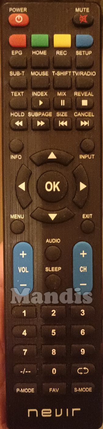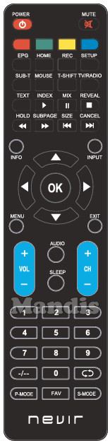 Power, Mute, Red, Green, Yellow, Blue, EPG, Home, REC, Setup, SUB.T, Mouse, T-Shift, TV/Radio, Text, Play/Index, Pause/MIX, Stop/Reveal, <</Hold, >>/Subpage, I<</Size, >>I/Cancel, Info, Input, Menu, Exit, Up, Down, Left, Right, OK, Audio, Sleep, Vol+, Vol-, CH+, CH-, 1, 2, 3, 4, 5, 6, 7, 8, 9, 0, -/--, Recall, P.Mode, FAV, S-Mode