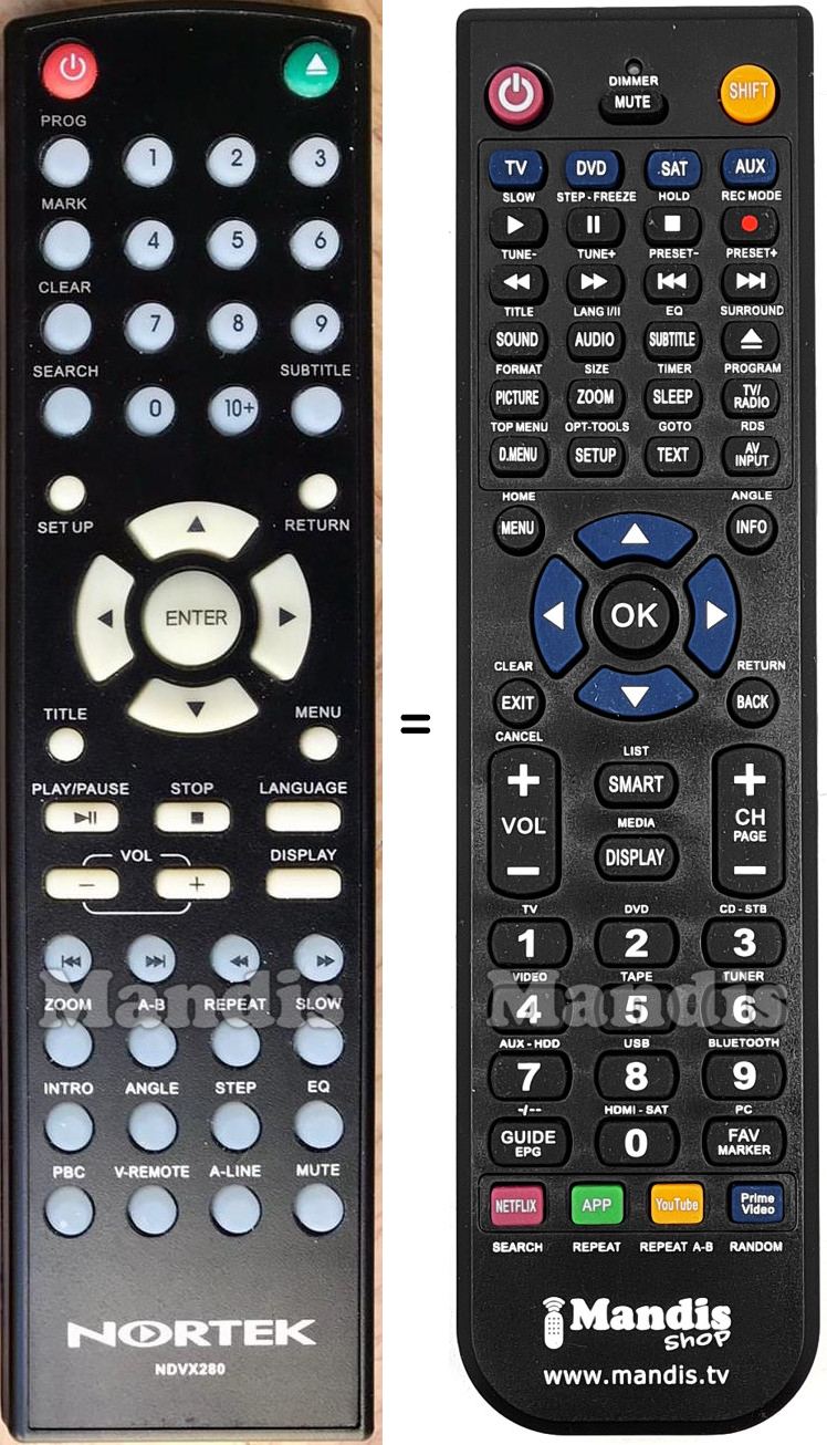 Below, we will show you the correspondence between each button on the original remote control and the button that performs the same function on the replacement remote control. In some cases, you may need to press the SHIFT key before pressing another button to perform certain actions. These additional functions are often not widely used and are included to facilitate understanding of the replacement remote control, or because the original remote control has more buttons than its equivalent.