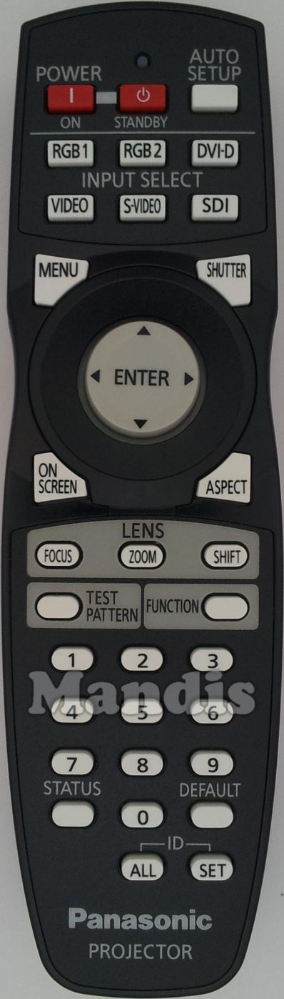 Power On, Standby, Auto Setup, RGB1, RGB2, DVI-D, Video, S-Video, SDI, Menu, Shutter, On Screen, Aspect, Up, Down, Right, Left, Enter, Focus, Zoom, Shift, Test Pattern, Function, 1, 2, 3, 4, 5, 6, 7, 8, 9, 0, Status, Default, ID All, ID Set