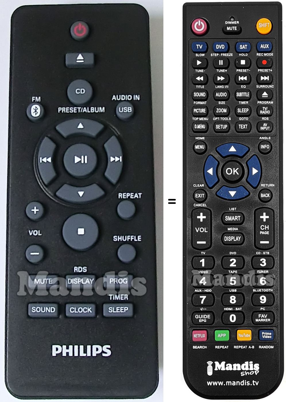 Below, we will show you the correspondence between each button on the original remote control and the button that performs the same function on the replacement remote control. In some cases, you may need to press the SHIFT key before pressing another button to perform certain actions. These additional functions are often not widely used and are included to facilitate understanding of the replacement remote control, or because the original remote control has more buttons than its equivalent.