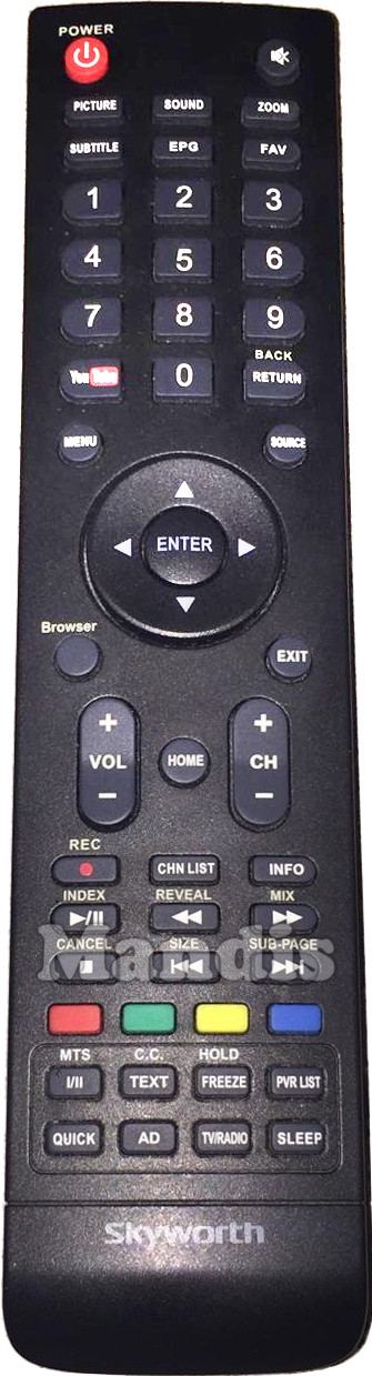 Power, Mute, Picture, Sound, Zoom, Subtitle, EPG, FAV, 1, 2, 3, 4, 5, 6, 7, 8, 9, 0, YouTube, Return / Back, Menu, Source, Up, Down, Right, Left, Browser, Exit, Enter, Vol +, Vol -, Home, CH +, CH -, Rec, CHN List, Info, Play / Pause / Index, << / Reveal, >> / Mix, Stop / Cancel, I<< / Size, >>I / Sub-page, Red, Green, Yellow, Blue, I/II / MTS, Text / C.C., Freeze / Hold, PVR List, Quick, AD, TV / Radio, Sleep