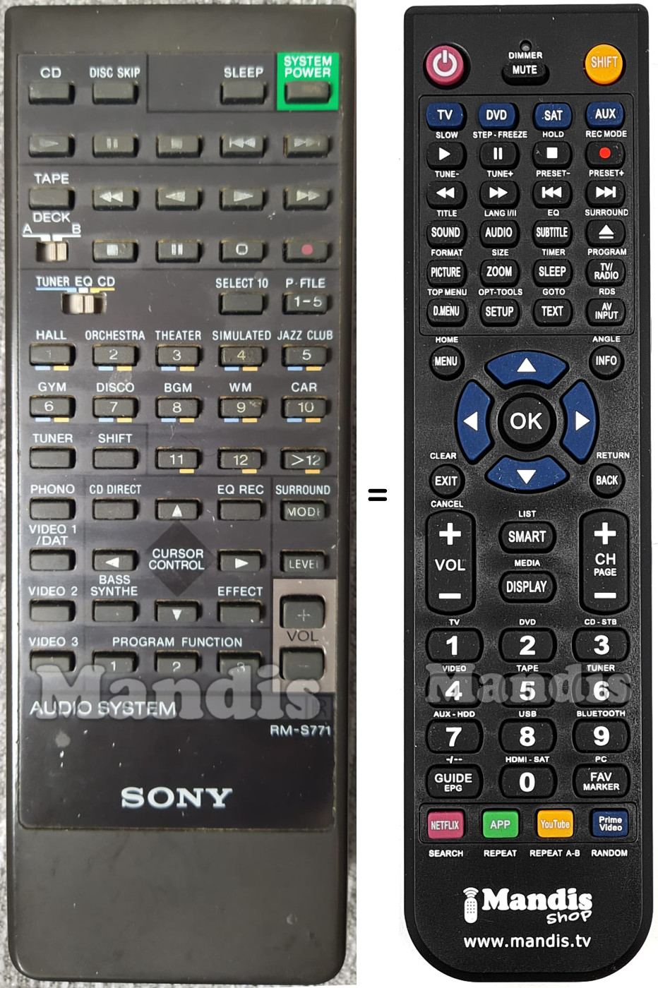 Below, we will show you the correspondence between each button on the original remote control and the button that performs the same function on the replacement remote control. In some cases, you may need to press the SHIFT key before pressing another button to perform certain actions. These additional functions are often not widely used and are included to facilitate understanding of the replacement remote control, or because the original remote control has more buttons than its equivalent.
