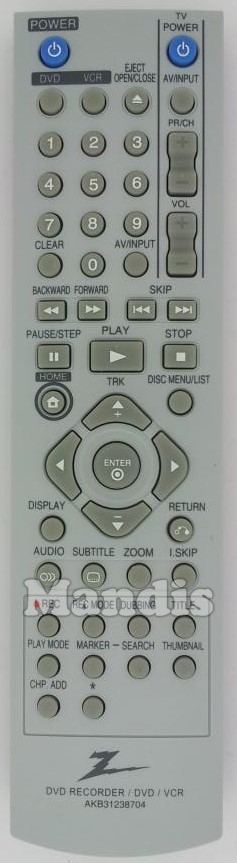 This remote control has the following buttons: Power, TV Power, DVD, VCR, Eject/Open/Close, AV/Input, PR/CH+, PR/CH-, Vol+, Vol-, 1, 2, 3, 4, 5, 6, 7, 8, 9, 0, Clear, AV/Input, <</Backward, >>/Foward, I<< Skip, >>I, Pause/Step, Play, Stop, Home, Disc Menu/List, TRK+, TRK-, Left, Right, Enter, Display, Return, Audio, Subtitle, Zoom, I. Skip, REC, REC Mode, Dubbing, Title, Play Mode, Marker, Search, Thumbnail, CHP ADD, *