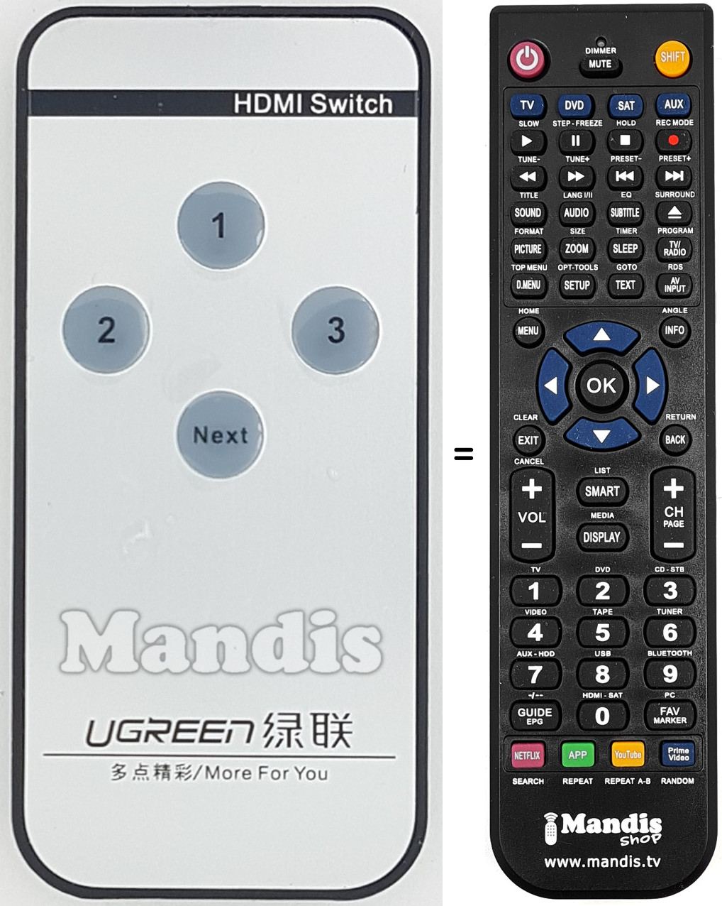 Sí, el comandament equivalent realitza totes les funcions, fins i tot quan el comandament original controla diversos aparells. Al comandament equivalent es poden programar els camps de diferents aparells (TV, DVD, SAT i AUX) d'aquesta manera es pot incloure totes les funcions del comandament original. Si visualitza el manual de les tecles (instruccions del comandament a distància) podrà comprovar que hi ha totes les funcions.