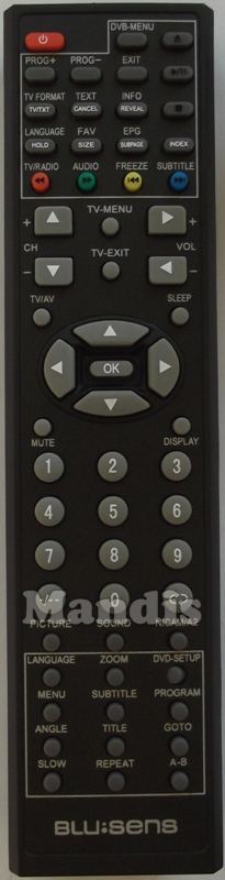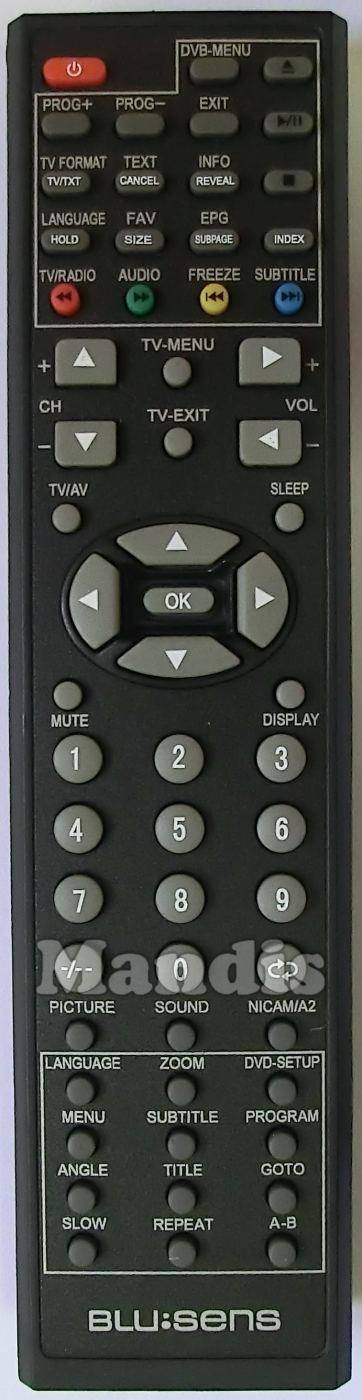 power, dvb-menu, eject, prog+ , prog-, exit, play/pause, tv format/ tv/ txt, text/cancel, info/reveal, stop, languaje/hold, fav/size, epg/subpage, index, red/<</tv/radio, green/>>/audio, yellow/i<</freeze, blue/>>i/subtitle, ch+, ch-, vol+, vol-, tv menu, tv exit, tv/av, sleep, mute, display, ok, up, down, right, left, 1, 2, 3, 4, 5, 6, 7, 8, 9, 0, -/--, recall, picture, sound, nicam/a2, languaje, zoom, dvd-setp, menu, subtitle, program, angle, title, goto, slow, repeat, a-b