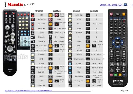 Este mando a distancia realiza todas las funciones del mando a distancia original: On / Source, Off, Shift, Channel-, Channel+, Quick Select 1, Quick Select 2, Quick Select 3, DVD/HDP, TV/CBL, VCR, Play, Stop, Skip+ / Favorite / Rev. Play, Pause / A/B, <<, >>, >>I / CH+, I<< / CH-, Vol+, Vol-, Muting, V.Select / Setup, Night / Audio, Up, Left, CH Sel / Enter, Right, Down, Dimmer / Menu/Guide, Display, Status / Return, Zone 2 Off, Zone 2 On, Main Off, Main On, 1 / PHONO, 2 / CD, 3 / TUNER, 4 / DVD/HDP, 5 / TV/CBL, 6 / VCR, 7 / DVR, 8 / V.AUX, 9, 0 / iPod, AUX, +10/DTU, Tuning+ / TV Vol+, Tuning- / TV Vol-, Mode / DVD Menu, Band / Pic Adjust, Memory / Subtitle, Cinema, Music, STD, D/ST, Pure, Simu, A.Menu / Setup, Input / Audio, Test / Display, Return, Up, Left, Ent, Right, Down