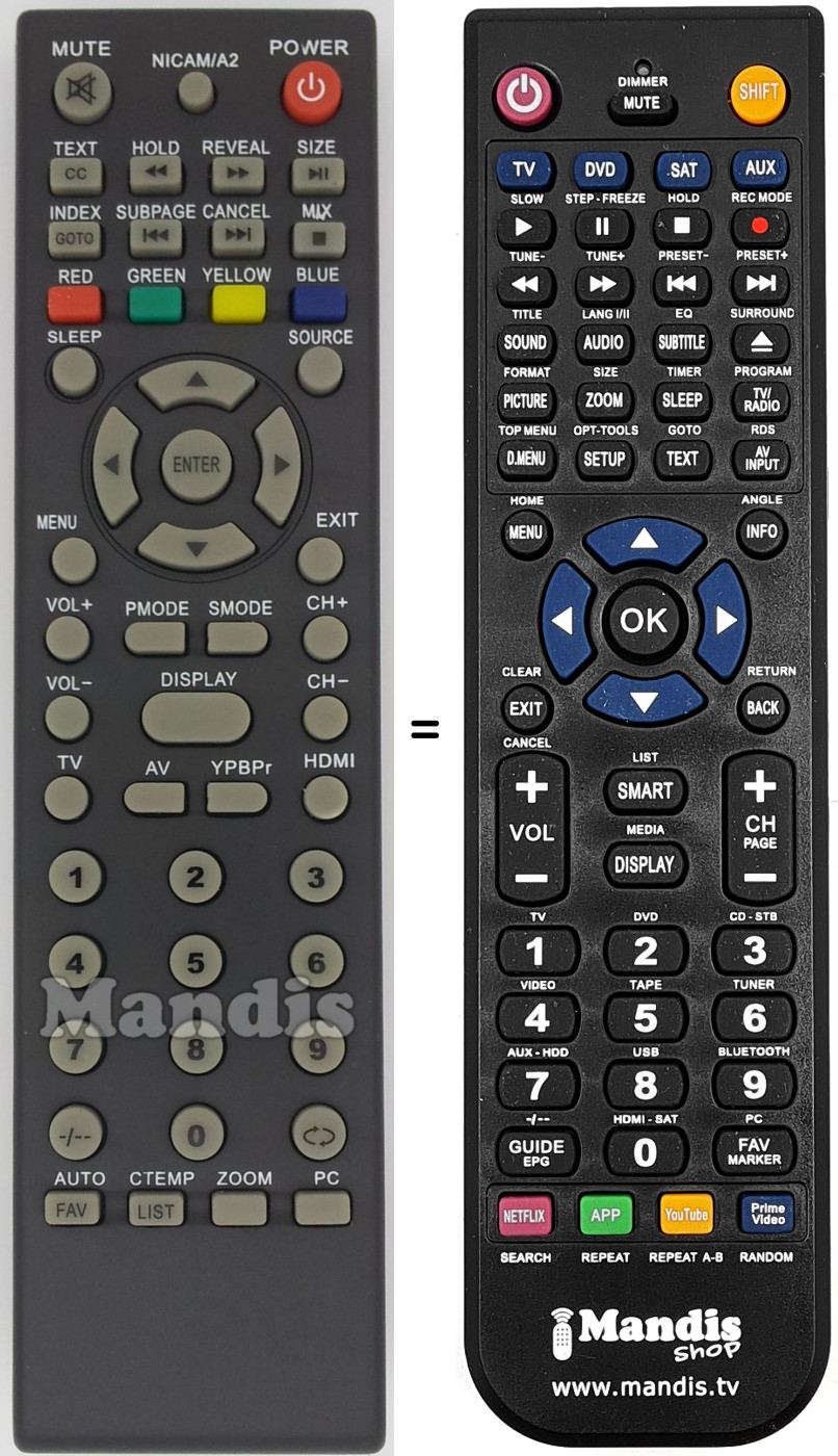 El mando equivalente realiza todas las funciones, incluso cuando el mando original controla diversos aparatos, en el mando equivalente se pueden programar distintos aparatos (TV, DVD, SAT y AUX) de esta forma se pueden incluir todas las funciones del mando original. Si si visualiza el manual de las teclas (instrucciones del mando a distancia) podrá comprobar que están todas las funciones.