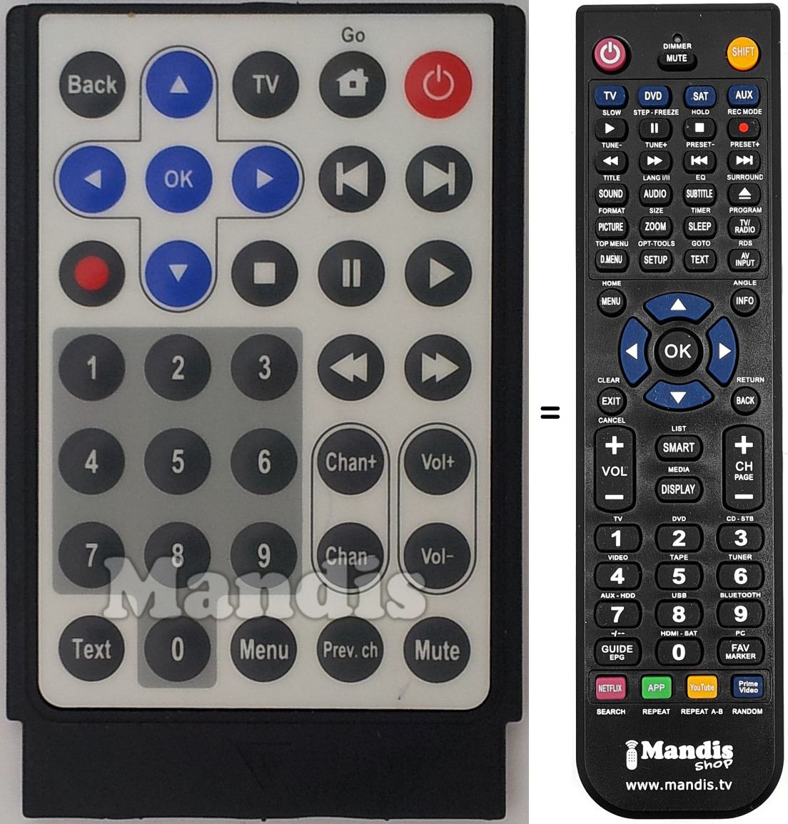Sí, el comandament equivalent realitza totes les funcions, fins i tot quan el comandament original controla diversos aparells. Al comandament equivalent es poden programar els camps de diferents aparells (TV, DVD, SAT i AUX) d'aquesta manera es pot incloure totes les funcions del comandament original. Si visualitza el manual de les tecles (instruccions del comandament a distància) podrà comprovar que hi ha totes les funcions.