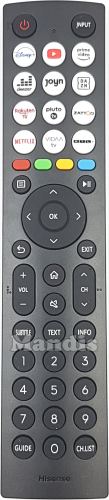 Este mando a distancia tiene los siguientes botones: Power, Input, Disney+, Youtube, prime video, deezer, joyn, DAZN, Rakuten Tv, pluto tv, Zattoo, Netflix, Vidaa tv, RTL+, Red, Green, Yellow, Blue, [=], Play/Pause, Up, Down, Right, Left, OK, Back, EXit, Home, Mute, Subtitle, Vol+, Vol-, CH+, CH-, Text, Info, 1, 2, 3, 4, 5, 6, 7, 8, 9, 0, Guide, CH.List