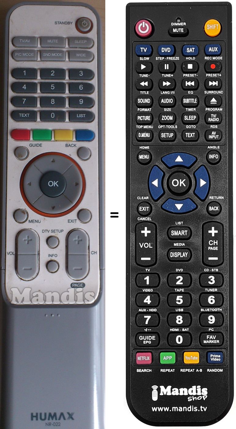 Mando a distancia que reemplaza al original NR022 en todas sus funciones.