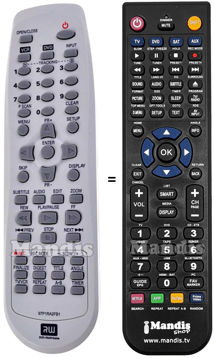 Este mando a distancia sustituye la mayoría de las funciones de tu 97P1RA2FB1. No es un mando a distancia universal, sino una copia con la mayoría de las teclas y funciones de tu original.