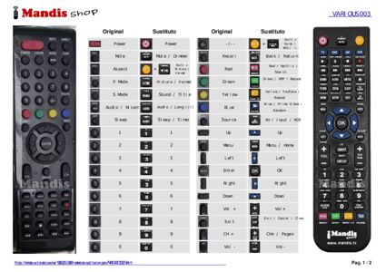 A continuación, le mostraremos la correspondencia entre cada uno de los botones del mando original y el botón que realiza la misma función en el mando de sustitución. En algunos casos, es posible que necesite presionar la tecla SHIFT antes de pulsar otro botón para realizar ciertas acciones. Estas funciones adicionales suelen ser poco utilizadas y se incluyen para facilitar su comprensión del nuevo mando a distancia, o porque el mando original tiene más botones que su equivalente.