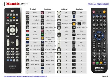 Este mando a distancia realiza todas las funciones del mando a distancia original: Power, Teletext, Dual I / II, , AV, Red, Geen, Yellow, Blue, Subtitle, Dual Window, Cancel, Option, Menu Analog, Menu Digital, Up, Right, Down, Left, OK, Analog / Digital, EPG, Vol +, Vol -, Mute, P +, P -, 1, 2, 3, 4, 5, 6, 7, 8, 9, 0, Info, P<P / Back, Ambilight ON/OFF, Ambilight Mode, Sound, Picture