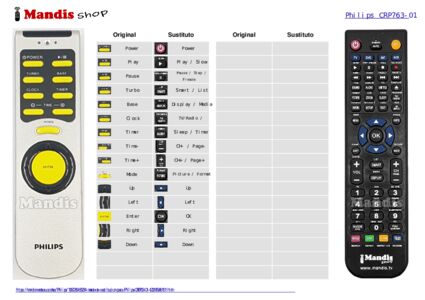 A continuación, le mostraremos la correspondencia entre cada uno de los botones del mando original y el botón que realiza la misma función en el mando de sustitución. En algunos casos, es posible que necesite presionar la tecla SHIFT antes de pulsar otro botón para realizar ciertas acciones. Estas funciones adicionales suelen ser poco utilizadas y se incluyen para facilitar su comprensión del nuevo mando a distancia, o porque el mando original tiene más botones que su equivalente.