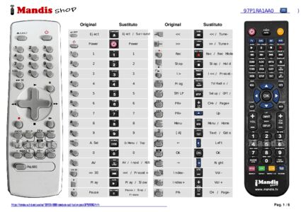 A continuación, le mostraremos la correspondencia entre cada uno de los botones del mando original y el botón que realiza la misma función en el mando de sustitución. En algunos casos, es posible que necesite presionar la tecla SHIFT antes de pulsar otro botón para realizar ciertas acciones. Estas funciones adicionales suelen ser poco utilizadas y se incluyen para facilitar su comprensión del nuevo mando a distancia, o porque el mando original tiene más botones que su equivalente.